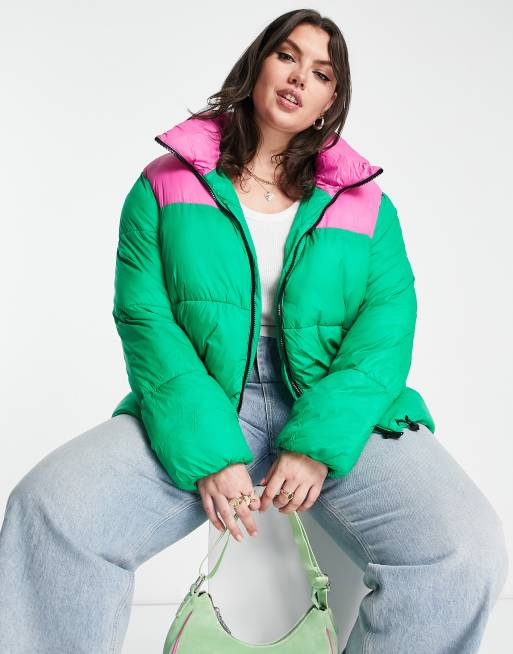 Noisy May Curve exclusive padded short coat in bright pink and green Very well made.